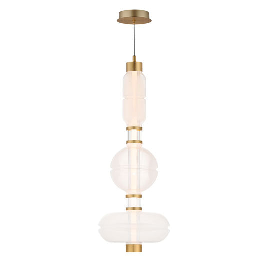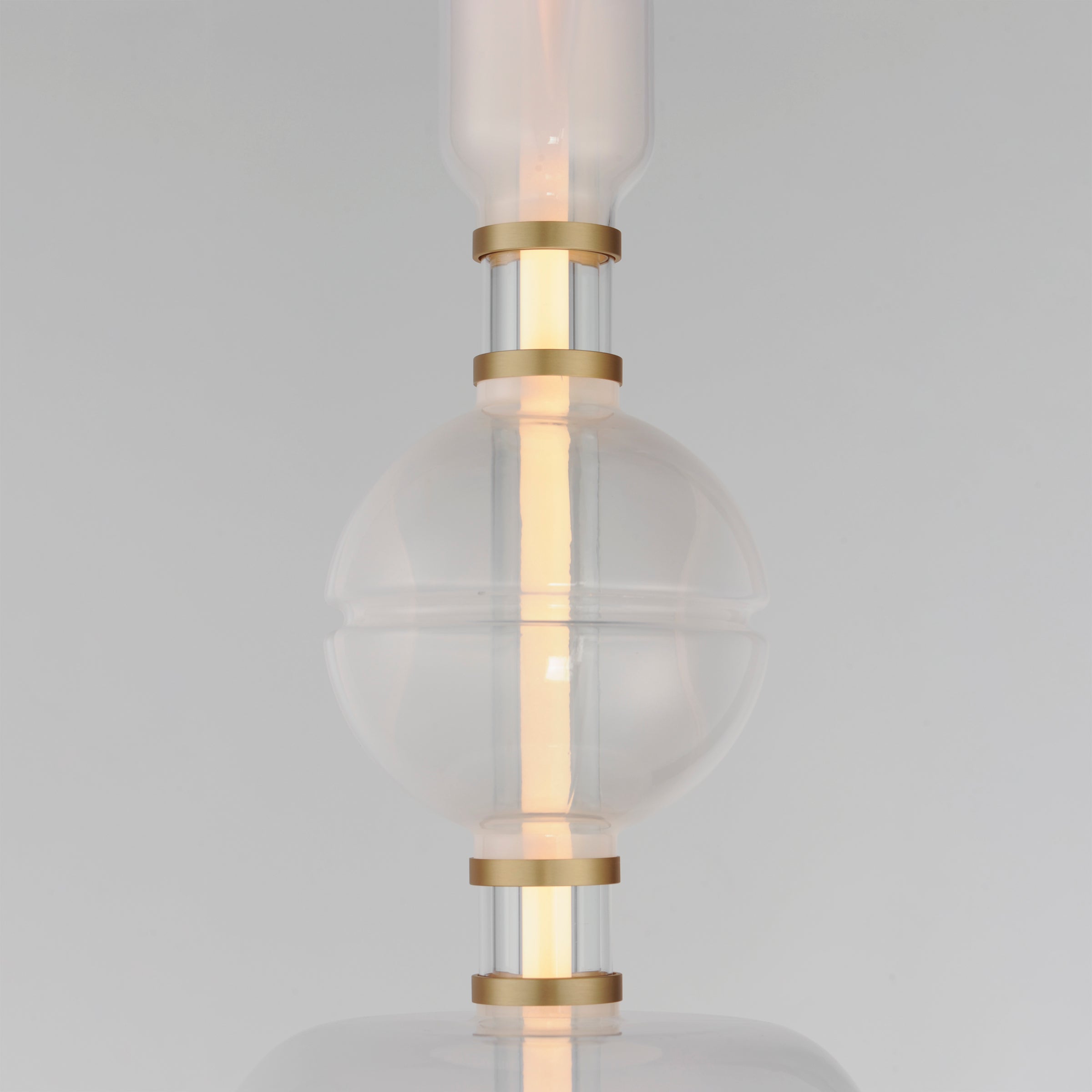 Futuristic and full of Gusto, the capsule collection designed by Cesar Giraldo features artisanal hand-blown glass elements colored in cloud-like white infused glass or gradients of smoked grey and warm amber tones. The glasses' hand-crafted dimples refract dedicated LED lighting that highlights an undulating silhouette throughout the fixture. Diffused evenly across a thin tube of white acrylic encased within a larger vacuum of clear glass, the airy compositions appear to be floating while amply filling spaces. Configurations include both horizontal and linear pendants, ceiling mounts, wall sconces and portable lamps sized for multiple applications. Available in metal accents finished in Gunmetal or Gold.
